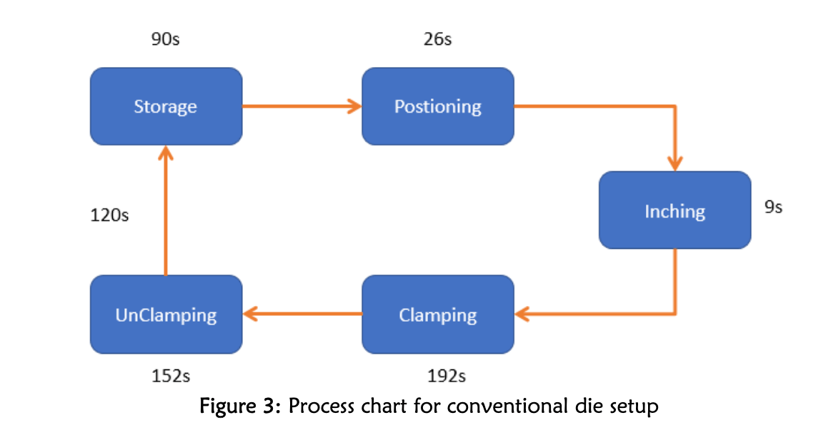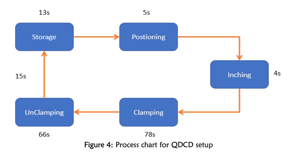 QDCS, QDCD ve QDCH’nin birleşiminden oluşur. QDCD çok hafif olduğundan elle taşınabilirken, geleneksel kalıplar kaldırma ekipmanı gerektirir. Gözlemde, kalıpların depodan alınmasından, makineye yerleştirilmesine, makine yüksekliğinin ayarlanmasına (ince ayar), sıkılması, klemplerin açılmasına ve kalıbın makineden çıkarılmasına kadar geçen süreler kaydedilmiştir. Her iki kalıp türü için bu adımlar karşılaştırılmıştır.